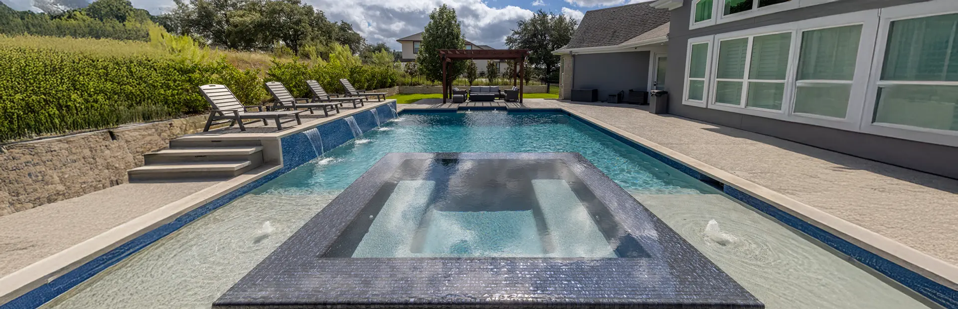Sleek sheets of water cascade into the pool, creating a clean and contemporary aesthetic.